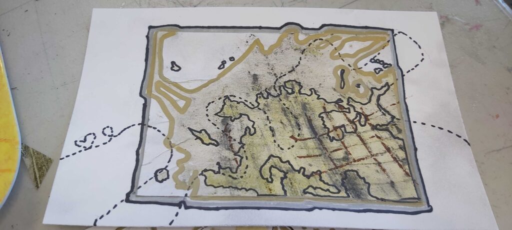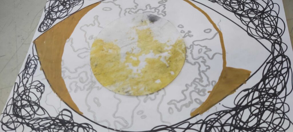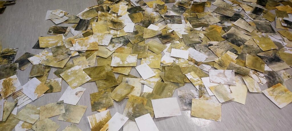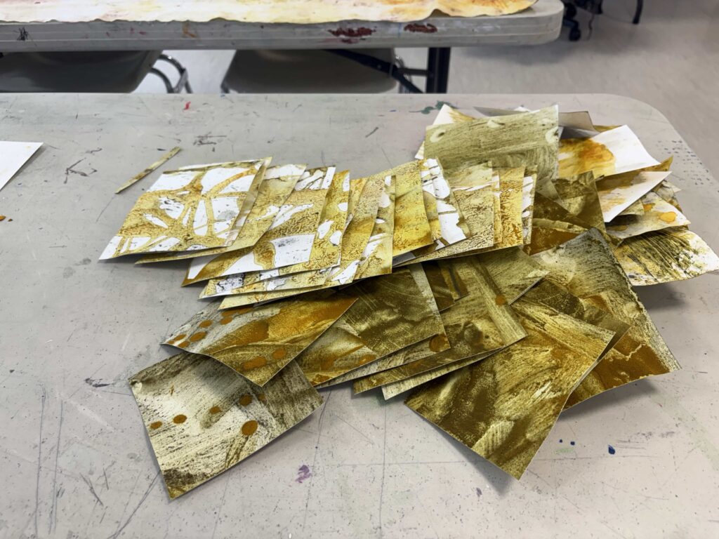 Participants will create individual pieces with pre-dyed papers, cutting, tearing, and collaging them onto a base sheet provided by the facilitators. Following the completion of their individual piece, they will then proceed to the larger collaborative piece. Participants can choose to include a part of their personal piece affixed to the canvas or add cut-outs from the pre-dyed paper or use markers and oil pastels directly on the canvas.